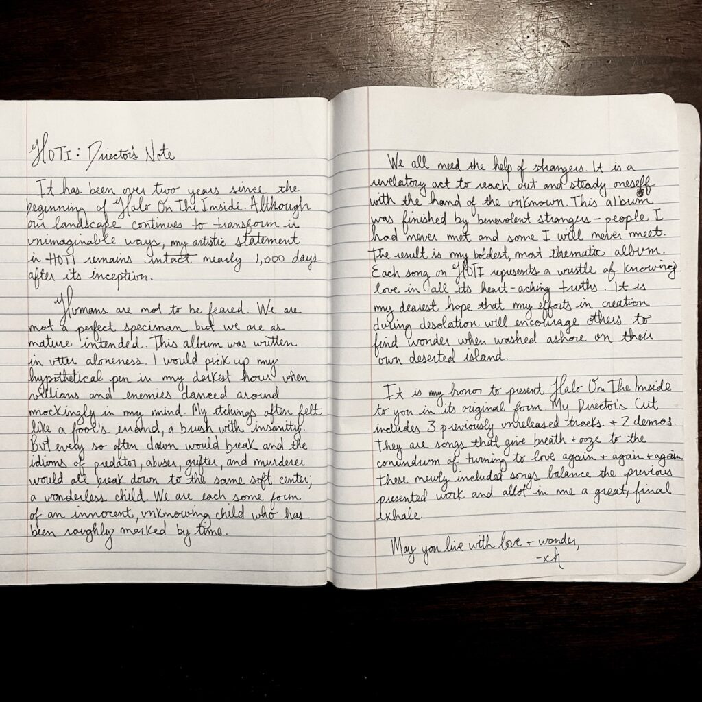 We all need the help of strangers. It is a revelatory act to reach out and steady oneself with the hand of the unknown. This album was finished by benevolent strangers – people I had never met and some I will never meet. The result is my boldest, most thematic album. Each song on HOTI represents a wrestle of knowing love in all its heart-aching truths. It is my dearest hope that my efforts in creation during desolation will encourage others to find wonder when washed ashore on their own deserted island.