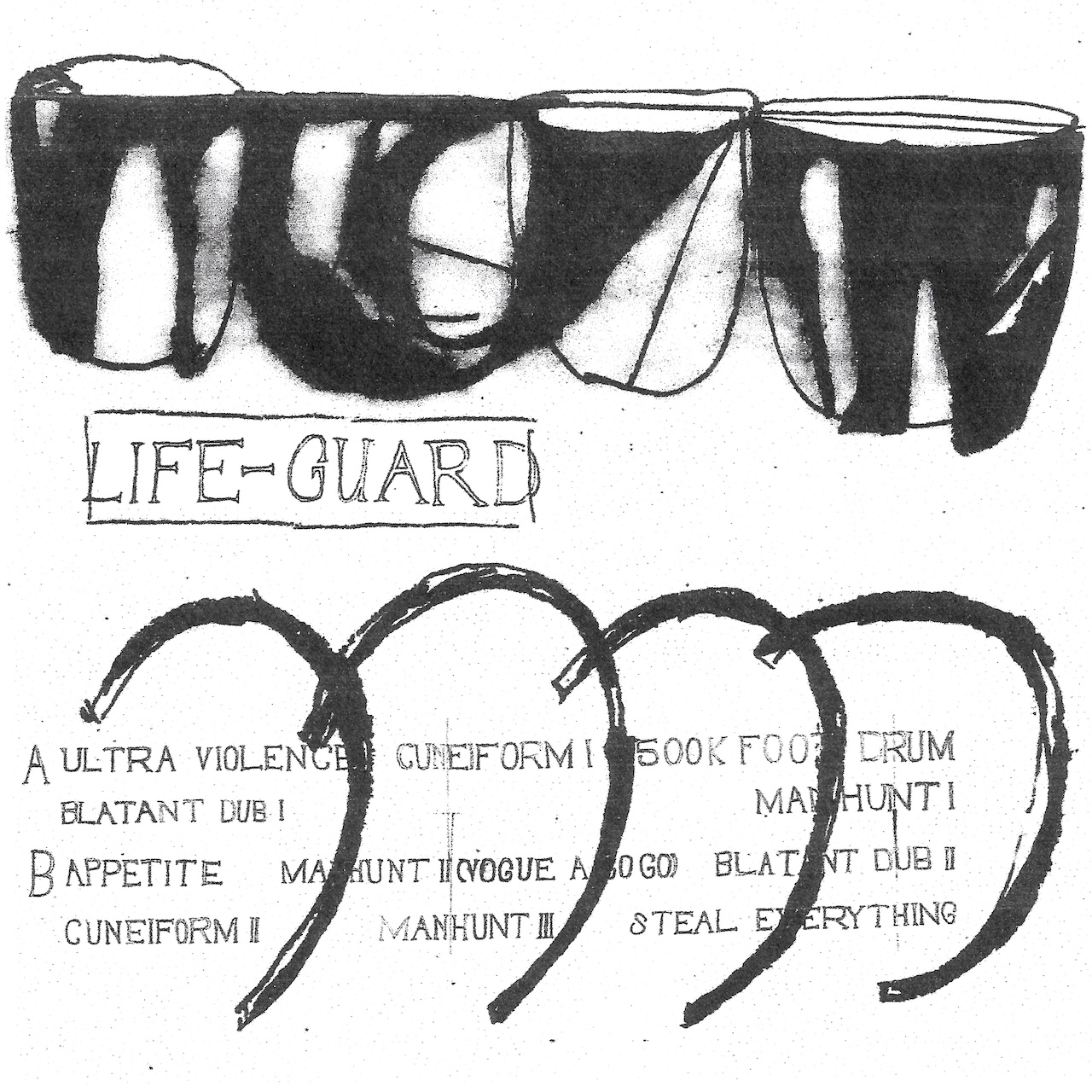 Recorded in Lifeguard’s Stulogulo, newly equipped with actually terrifying faces and friendly heroine carpet, plugged straight into the 8-track machine with the aid of the Dub soldiers, dirty mixing pots and Echoplexes, Lifeguard deliver these 11 tracks in under 15 minutes; 7 inches of LP-oriented fast and automatic music free from lingering, processing, over-thinking, or otherwise staving off release. The fully deterritorialized Ripped and Torn; the ripping and tearing of the band-aid.